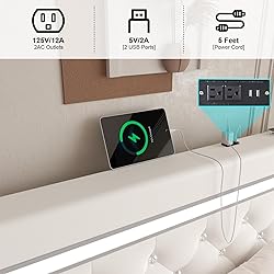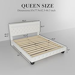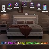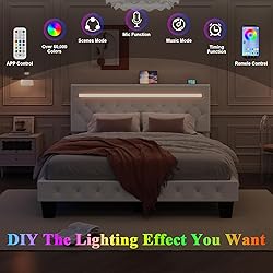 【RGB LED Lights】The upholstered platform bed with LED lights can remotely adjust the color, brightness, mode, and timing functions through the APP control. It can even support over 60,000 colors of LED lights. Provides a laid-back atmosphere for your evening. 【USB Ports & Socket】Queen Size Bed Frame is arranged for USB Ports and socket to charge your mobile phone, iPad, or other devices. No worry about the low battery, this charging station brings you extreme convenience. 【Adjustable Headboard】The 2 heights adjustable headboard aim to expand your mattress selection space. It can be adjusted between 42.3 to 46.3 inches, allowing you to use mattresses ranging from 10 to 12 inches. Choose the perfect mattress height based on your specific needs and preferences. 【Stable Structure】: Constructed with 12 solid wood slats and supported by 9 sturdy legs, this bed frame ensures stability and prevents wobbling or shifting. With a high weight capacity of 1200 lbs, it accommodates various body types and weights. The even weight distribution prevents mattress sagging, offering a better sleep experience and a refreshed wake-up feeling. 【Stylish and Comfortable】This Full Size Bed Frame with Headboard features PU leather on the headboard, wrapped around high elastic memory foam and embellished with diamonds in a button-tufted design. Not only is it soft and comfortable, but it also perfectly complements any bedroom style. Enjoy a more comfortable and relaxing time when reading or watching TV in bed. Reply to your internal messages within 24 hours during weekdays to resolve any issues you may encounter.