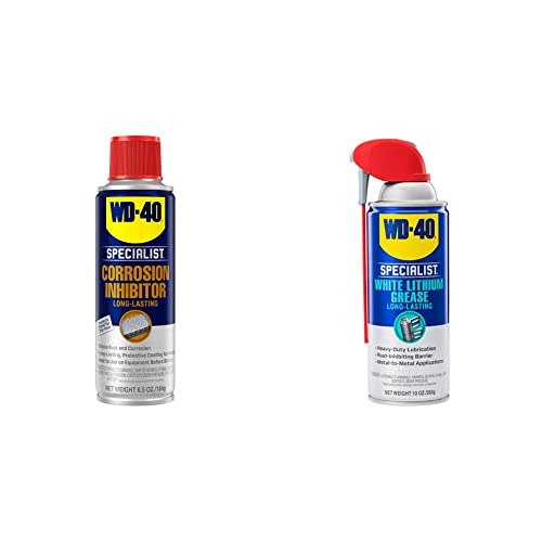 WD-40 Specialist Corrosion Inhibitor, Long-Lasting Anti-Rust Spray, 6.5 OZA long-lasting rust preventative that protects metal parts, blocking rust and corrosion for up to 1 year outdoors or 2 years indoors. WD-40 Specialist Corrosion Inhibitor is an anti-rust spray ideal for preventative maintenance and use in extreme environments such as high humidity. It provides non-drying protection that stays where you spray it. A must have for corrosion protection. - Protects against rust and corrosion 40x longer than competition* -Protects metals for one year -Extends life of tools and equipment -Ideal on equipment in storage -50-State VOC Compliant *Test Lab: Petro-Lubricant Laboratories Inc. (Lafayette, NJ); ASTM B117; Test date: 05/2020. B’laster is a registered trademark of B’laster Chemical Company Inc.WD-40 Specialist Protective White Lithium Grease Spray with SMART STRAW SPRAYS 2 WAYS, 10 OZAn aerosol grease that sprays on evenly as a liquid and sets dry for a thick protective coating that won't run off. WD-40 Specialist White Lithium Grease is ideal for metal-to-metal applications that require heavy-duty lubrication and leaves behind a rust-inhibiting barrier for protection against corrosion. This long-lasting formula won't melt, freeze, or run in harsh weather conditions. Also great for lubricating equipment before placing in storage. Sprays on easily with a thick, protective coating for outdoor and automotive hinges, gears, sprockets, latches, door tracks, pulleys, cables and guide rails. Safe to use on metals. Effective in temperatures ranging from 0° F to 300° F for unbeatable protection. - Long-lasting lubrication and protection - Lubricates 8x longer than the competition for less frequent reapplication* - Withstands 1.5x more pressure than the competition for less frequent reapplications and reduced downtime** - 50-state VOC compliant - NSF Category H2 (#146864) *Test Lab: Petro-Lubricant Laboratories Inc. (Lafayette, NJ); ASTM D5620A; Test date: 04/2020 **Test Lab: WD-40 Co. Technical Center (Pine Brook, NJ); ASTM D3233A; Test date: 12/2020