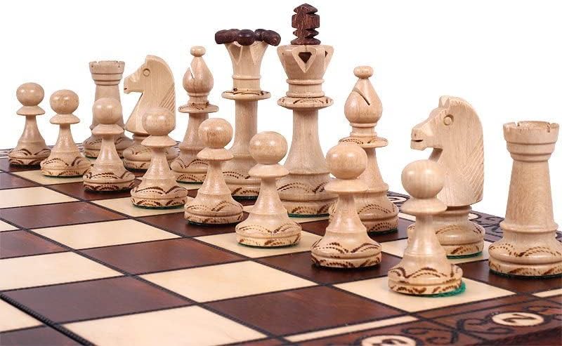Rey 3.35 (8.5cm) Reina 2.56"(6.5cm), Peón 1.46"(3.7cm), Tablero mide 16"W x 16"D. Los cuadrados miden 2"x2" (5cm x 5cm). El tablero está hecho de haya y abedul. Las piezas de ajedrez de fondo de fieltro están hechas de alcornoque y sicómoro. Las piezas de ajedrez son pesadas. Hecho a mano en Polonia.