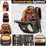 - Designed for professionals, this heavy-duty tool backpack features a spacious storage capacity in a compact 14.6" L × 7" W × 18.1" H size, providing ample room for hand tools, power tools, and jobsite essentials without feeling bulky—ideal for electricians, carpenters, HVAC technicians, and construction workers. Built from 1680D ballistic weave material, it offers exceptional durability against tears, punctures, and abrasions, while the moulded hard bottom with rugged POM base keeps the backpack upright and protects tools from impact, dirt, and moisture. A secure combination lock (default 0-0-0) adds peace of mind during transport, and the pull-out tool storage allows quick access to frequently used tools. Multiple pockets and organized slots keep everything in place, while the padded back panel and adjustable shoulder straps ensure comfortable carry and reduced fatigue throughout long workdays.