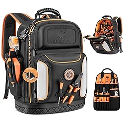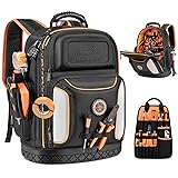 Tool Bag Backpack, 75 Pockets & Loops Heavy Duty Tools Organizer Bags/HVAC Tool Carrier for Eelectrician/Construction Work with Molded Base and Combination Lock, Large, Black and Orange