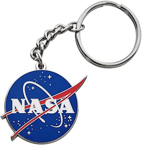 NASA logo metal keychain with silver-tone plating and hard enamel colors.