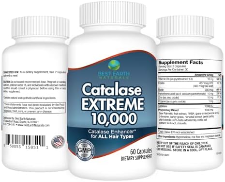 Catalase Extreme 10,000 is a vitamin supplement with a substantial 10,000 units of the catalase enzyme, formulated to help replenish declining catalase levels in the body—a natural process that occurs with age. As catalase levels decrease, the body's ability to break down an internally produced compound also diminishes, potentially affecting the aging of hair. This can result in weakened, aging hair from within. The Catalase formulation combines the Catalase enzyme with a potent blend of nutrients, including Saw Palmetto, Biotin, Fo-Ti, PABA, copper, and numerous other beneficial elements. Catalase plays a role in breaking down a specific compound into harmless substances, maintaining long, beautiful hair. Three Full Size Bottles