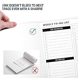 - Say goodbye to chaos and hello to organization with the Ultimate To Do List. Our Weekly To-Do List Notepad has multiple sections that allow you to organize and track your tasks better than just a regular list. With its minimalist and functional design, it’s never been easier to separate and prioritize your tasks. Each sheet of the Weekly To Do List Notepad includes separate spaces for each day, as well as sections for a to do list and top priorities. With 52 sheets measuring 8.5 in x 11 in, there is plenty of space to write down everything you need to do. Even better, the notepad is made with premium, non-bleed paper, you can use your favorite writing tool, even if it’s a permanent marker, without worrying about ruining the next page. The notepad also features a sturdy backing so that you can use it anywhere, anytime, even without a writing surface! This makes it the perfect tool for use at home, at work or on to go. Our Weekly To Do List Notepad comes with easy-to-tear-off pages, so you can share your notes with others or have a fresh start the next day. It's perfect for those who want to collaborate with a team, or simply prefer to start each day with a clean slate. Whether you're a busy professional, a student, or a stay-at-home parent, our notepad is the perfect tool to keep you on track and motivated. With its functional design, premium paper quality, and easy-to-tear-off pages, you'll wonder how you ever managed without it. Get yours now and see the difference it can make in your life!