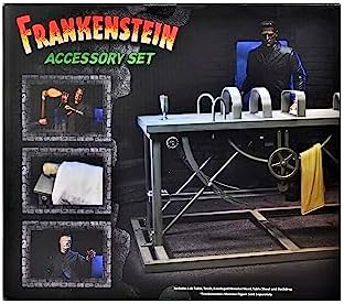 ¡Construye escenas y dioramas aún más grandes con este set de accesorios para la figura de acción Frankenstein's Monster de Universal Monsters de NECA! Como en la película, la pieza central del set es la enorme mesa de laboratorio, que mide más de 9 pulgadas de largo y se adapta a la figura de acción de NECA (se vende por separado). El set también incluye una cabeza vendada adicional para el Monstruo, una tela y una linterna como accesorio. Embalaje en caja cerrada.