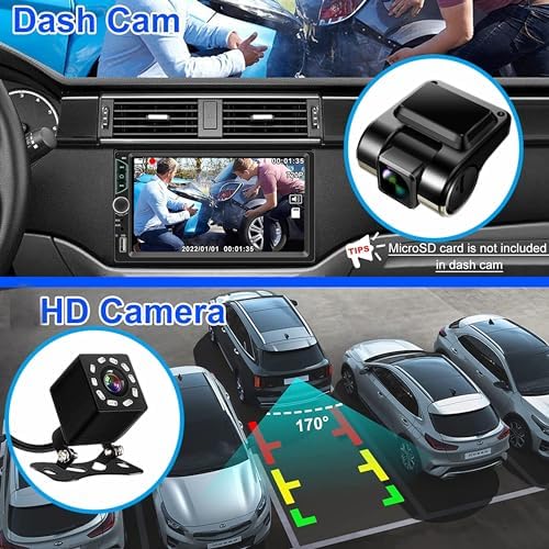 - 【Cámara de salpicadero de 1280P y cámara de respaldo de 720P】Nuestro estéreo de coche doble DIN está equipado con una cámara trasera y una lente móvil ultra gran angular de 140° para la cámara del salpicadero (excluyendo la tarjeta microSD, recomendamos utilizar la marca Sandisk de clase 10 o superior, compatible con un sistema de archivos Fat32 de hasta 32 GB), que puede minimizar los puntos ciegos y capturar más detalles; al dar marcha atrás, puede ver el vídeo en la pantalla de transmisión a través de la cámara de pantalla negra. Haga que su marcha atrás diaria sea más segura.