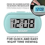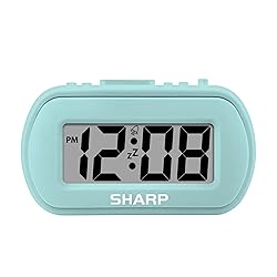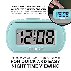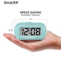 - This compact SHARP alarm clock is ideal for saving space on your nightstand. The ascending alarm never startles you like traditional alarm clocks. It offers you a gentler wakeup experience. The alarm clock has a soft rubber finish making it difficult to knock over and just fun to touch! The button controls are easily accessible from the top of the alarm clock. You can easily illuminate the display with its blue backlight by pressing the snooze button. The display will light up for 5 seconds and turn off to extend your battery life.