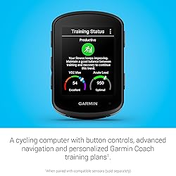 Advanced GPS cycling computer with button controls combines superior navigation, planning and performance tracking, cycling awareness and smart connectivity Battery life: up to 26 hours in demanding use cases; up to 42 hours in battery saver mode View daily suggested workouts and training prompts on screen; based on your event, get personalized coaching that adapts to your current training load and recovery when riding with a compatible power meter and heart rate monitor Find your way in the most challenging environments with multi-band GNSS technology that provides enhanced positioning accuracy See remaining ascent and grade when climbing so you can gauge your effort with the ClimbPro ascent planner, now available on every ride — no course required; view on your Edge device and in the Garmin Connect app on your smartphone for ride planning Classify your strengths as a cyclist, and compare your cycling ability to the demands of a specific course, so you can focus your training and improvement in the right areas, when paired with your compatible power meter and heart rate monitor Manage your efforts with the power guide feature, which recommends power targets throughout a course, when paired with your compatible power meter Get stamina insights while you ride, so you can keep an eye on how much longer you can really push it, when paired with your compatible power meter and heart rate monitor Stay on top of your training program with prompts to complete missed workouts Ride like a local, whatever your bike type, with improved ride type-specific maps that highlight popular roads and trails plus searchable points of interest