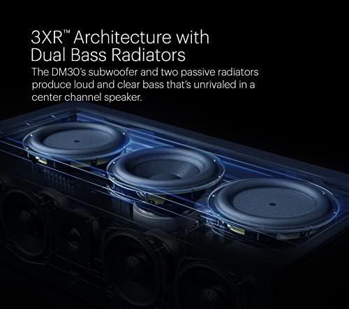 Level up your home theater audio with the Definitive Technology Dymension DM30 Flagship Center Channel Speaker - a hi-tech center speaker that delivers impressive performance in any home stereo system. This speaker features four 5.25" Balanced Double Surround System midrange woofers to improve excursion and produce better midrange detail. Its 1" custom aluminum oxide tweeter for explicit voice provides a smooth extended response with crisp transients and exceptional definition. The 3XR Architecture combines an integrated 8” powered subwoofer and two passive radiators in this speaker. The Patented Intelligent Bass Control blends subwoofer output with mids and highs. This speaker also has a Patented Linear Response Waveguide that extends off-axis dispersion for total sonic immersion. The acoustically transparent black cloth grille wrapping this center speaker lets it disappear virtually in dim room lights. Be it an onscreen movie drama, melodies of your favorite singers, or hearing the sonic details while gaming, this center channel speaker always perform to the best of its caliber. The consistent sound across Definitive Technology gives you the flexibility to mix and match Dymension, Dymension CI, and Mythos speakers (sold separately) to design a complete home system.