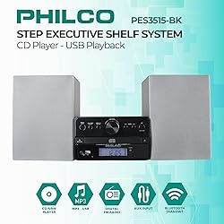 - Philco Stereo Shelf Systems Tray Loading CD Player with Digital FM Radio, Bluetooth Streaming, Remote Control in Silver | LCD Display | 3.5mm Headphone Jack | MP3 & AUX Port Compatible | USB Input STEREO SHELF SYSTEMS - our shelf stereo system CD player with a total 15W RMS output (2 x 7.5W), has a programmable CD player with digital FM stereo radio and tuning that sounds great and perfect for playing your music. HOME STEREO SYSTEM - this stereo system for home has USB playback and MP3 compatibility that make it a versatile sound system for music, perfect for any room in your home. Supports audio CD, CD-R/CD-RW and books on CD making it a great choice. BLUETOOTH STEREO SYSTEM - our shelf stereo system for home is great to enjoy music in your office, bedroom, living area, or kitchen. Connect to your smartphone, tablet or other devices via Bluetooth or the Aux port to listen to your music or videos.