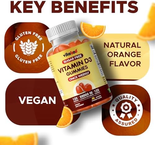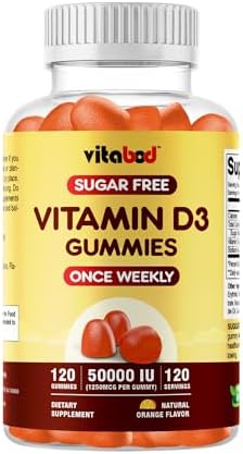 Apoye su salud ósea, dental e inmunológica con las Gomitas de Vitamina D3 Sin Azúcar 50,000 UI Semanales de Vitabod. Cada porción ofrece una potente dosis de 50,000 UI de Vitamina D3 en una gomita sin azúcar y fácil de masticar, diseñada para adultos que buscan una forma conveniente de mantener una salud óptima. Con 120 gomitas por botella, estas gomitas no-GMO son perfectas para sus necesidades semanales de vitamina D, promoviendo huesos más fuertes, un sistema inmunológico más saludable y bienestar general.