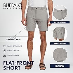 COTTON SHORTS FOR MEN: Get the comfy fit you need with durable, functional shorts and plenty of pocket space in these men’s flat-front shorts. They feature side cargo pockets, a coin pocket, back flap pockets, belt loops, and a button closure. COMFORTABLE FIT: Express yourself with style that lasts. These convenient, casual shorts feature a solid texture in colors made from only the finest cotton. Live in ultimate comfort through every indoor or outdoor activity. EASY TO WASH: These comfortable cotton shorts for men are great for pairing with all your warm-weather essentials. To keep these men’s shorts looking bold, machine wash them in cold water with like colors and tumble dry on low or hang dry. FASHION THAT MOVES US FORWARD: We make sure our garments are versatile so they have a minimized impact on the world we live in during their life cycle. When possible, minimize washes between wears to extend their life and help reduce impact on the planet. SINCE 1972: Buffalo has always seen denim as a means of expression. We dress you from the “bottoms up” with the perfect fits, finest fabrics, and timeless washes and use responsible practices. This is who we are. We are Denim.