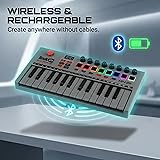 Wireless Freedom: Enjoy the convenience of Bluetooth MIDI connectivity, eliminating the need for cables and allowing for a clutter-free setup that can be used with laptops, mobile and tablets. Rechargeable Battery: The built-in battery lets you play and produce music anywhere, making it perfect for musicians on the move. Versatile Controls: Includes 8 backlit velocity-sensitive touch pads and 8 360-degree control knobs for comprehensive music production control. Innovative Joystick: The omni-directional joystick provides dynamic pitch and modulation control, adding expressiveness to your performances. Seamless Compatibility: With driverless plug-and-play connectivity, this USB MIDI keyboard works effortlessly with popular DAWs like GarageBand, FL Studio, Logic Pro X, and Ableton.