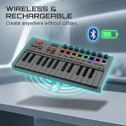 - Experience the ultimate in wireless music production with the RockJam Rechargeable 25 Key USB MIDI Keyboard Controller (RJMK25). This innovative mini keyboard piano features Bluetooth MIDI connectivity, allowing you to create music without the hassle of cables with any device, tablet, mobile & laptop. Equipped with 25 mini keys, 8 backlit velocity-sensitive touch pads, and 8 360-degree control knobs, this keyboard offers comprehensive control. The built-in rechargeable battery ensures you can take your music on the go. Compatible with major DAWs, this MIDI controller is perfect for both studio and portable use. These features make the RockJam RJMK25 an essential tool for any musician seeking wireless freedom and versatile control in a portable MIDI controller.