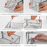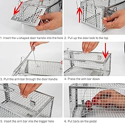 【Medium Sized Dimensions】- The humane live rat traps cage size: L: 10.6" x W: 5.5" x H: 4.5". Great choice for catching SMALL rats, mouse , mice, vole, hamster. Safe for pets. PLEASE NOTE: It is not suitable for large rodents ( LIKE Opossum, Squirrels and Chipmunks) 【High Sensitive 】- Simply raise the door and place baits on Pedal and attach the lever to the trigger bar to set. Once the mouse is going to this sensitive cage trap, the trigger is touched, the door will be auto-locked immediately and keep the critters in it. 【Easy to Install】 - The seventh picture has an installation video. Please check the video before installation! Additional, You need to correctly insert the u-shaped door handle into the hole on door before assembling. If you have any questions about installation, please contact us in time. 【Reliable & Reusable Live Rat Traps】- Use the bait that small animals like. Suitable for indoor, outdoor, kitchen, indoor, garage, yard, garden, Patio use. After an small animal or rodent is caught, you can release them at any time, and the trap can be re-baited and used over and over again. 【Sturdy and Durable Cage Traps】 - The Humane Rat Rodent Traps are made of thick and durable Aluminum mesh to prevent animals from chewing or clawing, which is also reducing the risk of human-rodent contact. Safety and Humane.