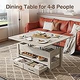 [Split Lift-top Design / 3 Ways to Use] The split table top can be lifted in different directions to offer two independent-use spaces, allowing you and your family to use the table separately without interruption. The larger table top board can be turned 180 degrees freely for dining. So this coffee table is not only a functional table in the living room or reception room but also a home office desk or dining table. [Large Storage Spaces] Beneath the handy lift-top surface are 3 hidden storage areas that provide you with the perfect spot to stow away any around-home essentials you typically wouldn't want your guests to see. 1 open shelf provide perfect place for you to display exquisite decorations. 2 sliding drawers expand your available storage space for an uncluttered living room. [Sturdy & Durable Structure] High-quality metal gas support mechanism, better than the traditional compression spring to make the table easy to lift, no noise. With wooden construction and selected materials, to ensure durability and stability, and will not shake or tilt during use. [Multi-functional Table] This practical table is definitely a worthy investment for any limited space like small apartments, dorms, and dens. This piece is not just a coffee table, it also serves perfectly as a temporary dining table or a computer desk. Size:19.7"-39.4"x39.4"x 20.1"-26.8", close size: 19.7"x 39.4" x20.1'', fully expanded size: 39.4" x 39.4" x 26.8''(Caution: Lower table must be raised first to avoid damage. ) [Easy & Fast Setup and Clean] Following the instruction and use the tools provided, assembly complete effortlessly within 45mins. Melamine veneer, waterproof, heat-resistant and dust free, you just need a damp cloth to keep it clean. Frame made of FSC-Certified wood