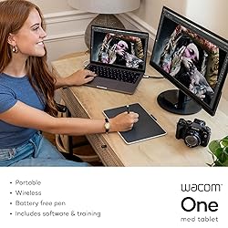 Entry-Level Tablet: Drawing tablet dimensions are 9.92" x 7.13" x 0.31" with a 8.5" x 5.3" active area; pen-on-paper feeling for digital pen starters, drawing, editing photos, or visual communication Precision Pen Performance: Included Wacom One Pen features natural tilt recognition, virtually lag-free tracking, 4096 levels of pressure sensitivity, and 2 customizable switches Optimal Efficiency: Shortcut buttons on the pen can be customized for your favorite keyboard shortcuts like undo or copy/paste, helping you stay immersed in your art Multiple Compatibility: Connect to Windows PC, Mac, Chromebook, and Android smartphones and tablets via USB-C (some devices require 2nd USB-A adapters) Includes: Medium Wacom One graphic design tablet, battery-free Wacom One Pen, power adapter, USB-C cable and quick start guide