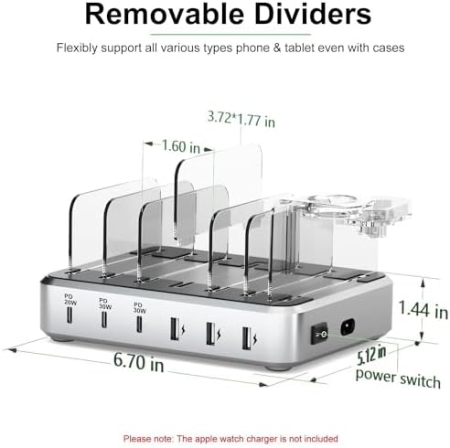 - 【New Upgraded Stand for Watch and Earbuds】Considering that family members are not only have phones and tablets devices, so this compact charger station is specially designed for iWatch and Earbuds (Watch Charger not included). With 6 charging ports and an upgraded charger stand, you can charge up to 6 devices at the same time, it helps minimize messy cables and the need for multiple wall chargers, keeping your desk tidy and organized