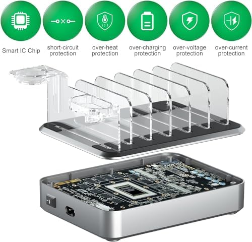 - 【Safe Protection & Intelligent】This charging station for multiple devices will automatically identify and distribute the corresponding power to different devices, keep your phones charging in a safe range. Equipped with a safety switch to completely cut off the current from the wall charger. Short-circuit protection, over-current protection, over-temperature control. Made of fireproof material and come with non-slip pad