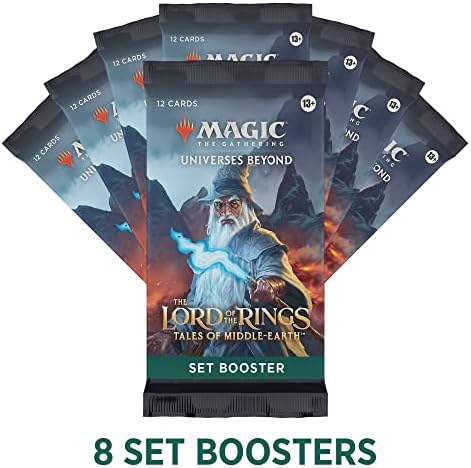• CONTENIDO—8 Boosters de Juego de The Lord of the Rings Tales of Middle-earth MTG, 4 cartas tradicionales con arte alternativo sin borde, 40 cartas de tierra (20 con foil, 20 sin foil), 1 contador de vida Spindown, 1 caja de almacenamiento de cartas y 2 cartas de referencia