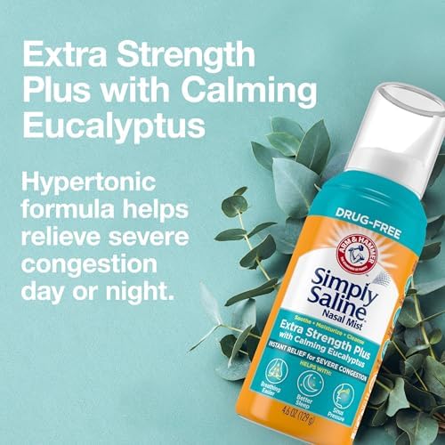 This Extra Strength formula with calming eucalyptus helps combat severe congestion associated with allergies, cold, flu and sinus infections. Simply Saline contains ARM & HAMMER Baking Soda for a drug-free way to dry mucus and clear nasal passages, making it safe to use with your other cold or allergy medicines. Plus, its adaptable nozzle and gentle mist make it easy to use, as often as needed. To breathe easier and get your nose back, try ARM & HAMMER Simply Saline Extra Strength Plus with Calming Eucalyptus.