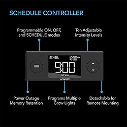 Two 11” UV LED bars designed for supplemental ultraviolet lighting to assist primary grow lights. Helps improve grow light quality to draw out plant expressions by simulating the sun’s UV rays. Enhances fruit and flowering stages by utilizing a targeted UVA spectrum of 365nm and 395nm. Features a digital controller with ten light intensity levels and daily schedule programming. Can magnetically mount onto your grow tent's frame or canvas using the included steel bars.