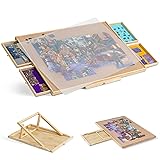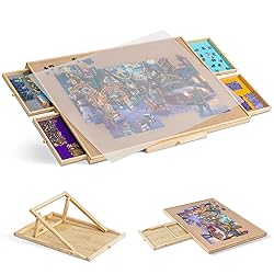 A Combination of Puzzle Table & Stand - Package includes an adjustable stand with 3 angle adjustments to help avoid stiff neck and sore back, allowing you to enjoy your puzzle fun. More importantly, you may fold and insert the stand into the puzzle table for easy storage when it is not in use. 4 Colored Drawers - Equipped with 4 drawers in different colors to help you sort out puzzle pieces or store your unfinished game. Each drawer is designed with a small magnet to make sure it stays closed when not in use and prevent puzzle pieces from missing. PP Dust Cover - Comes with a PP cover to protect your puzzle pieces against dust, water, and naughty pets. Premium Material - Our puzzle board is processed out of premium flannelette and polyester fiber. Usable area measures 35.43 × 24.41 in and fits most 1500 pc jigsaw puzzle games. Soft covering is good for immobilizing puzzle pieces and preventing them from missing. 10 stable anti-slippads on the back help to protect your tabletop and keep the puzzle table stable. Easy to Transport - Allows you to play jigsaw puzzle game and move your unfinished game anywhere you like. When you need extra space to sit or eat, just cover your puzzle pieces with the PP cover, close the drawers, fold and insert the stand into the puzzle table, and then store it under the couch or bed to save space. Your puzzle game can be secured and stored in seconds.