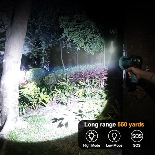 - EXTRA BRIGHT HEAVY DUTY FLASHLIGHT: Its brightness is several times that of the small model.This extra bright LED spotlight casts a super bright high lumen beam out to an incredible 550 yards. LEDs boast an extended 50000-hour lifespan. Features 4 adaptable settings: High / Middle Low / SOS(Long press 3 seconds).