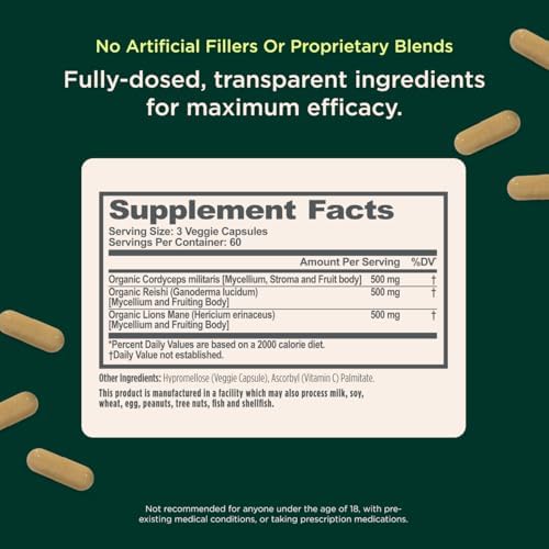 - Enfoque Mejorado, Energía e Inmunidad: Una potente mezcla de Lion's Mane, Cordyceps y Reishi mejora la cognición, el enfoque y la claridad mental, con Cordyceps aumentando el ATP para energía sostenida, Reishi promoviendo el bienestar y la adaptación al estrés, y Lion's Mane entregando compuestos bioactivos para la salud cerebral y la neuroprotección