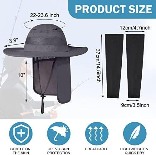 Features: Adjustable buckle: the strap is adjustable, so you can keep it as loose or tight as you want. Widely applied: ideal for fishing, hiking, mountaineering, camping, travelling, backpacking, climbing, cycling. Specifications: Material: mainly polyester fabric Color: sun hat: grey, beige, navy blue, dark grey, brown, blue. Sleeves: classic colors, grey, beige, navy, black Size: one size Hat: head circumference: 22-23.6 inch/ 55-60 cm, brim width: 3.9 inch, neck flap length: 10 inch Package includes: 6 Pieces fishing hats 6 Pairs arm sleeves Notes: Manual measurement, please allow slight errors on size. The color may exist a slight difference due to different screen displays. Handwashing is recommended.