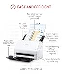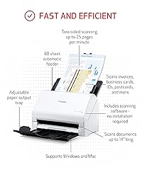 Stay organized: Easily convert your paper documents into searchable digital formats Reliably handles many different document types individually or in mixed batches: documents, invoices, contracts, business cards, and more Easy Setup: Simply connect to your computer using the supplied USB cable Fast and Efficient – Easily scan both sides of a document at the same time, at up to 25 pages-per-minute, and with a 60 sheet automatic feeder Built-in Software – Use your scanner with ease as the powerful scanning software is already built-in, requires no installation, and updates automatically