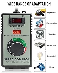 Wide Application: Router speed controller can regulate speed, temperature, voltage and light, which is suitable for US standard A and B plugs, widely used in exhaust fans, electric furnaces, angle grinders, marble machines, blowers, Note: It can't be used in electrical appliances with circuit boards and capacitance electronic components, such as microwave ovens, induction cookers, rice cookers, water pump, washing machines, LED energy-saving lights etc High Quality Material: Fan speed controller uses high-quality ABS plastic insulated flame-retardant shell, which is not discolored, deformed, cracked, high temperature resistant, The internal fittings are made of thickened phosphor bronze, which is safe and reliable in quality and has a longer service life, Note: Your device's startup current should be less than 15A. If it exceeds 15A, this product cannot be used High Precision Display: Rheostat variable speed control adopts precision pressure regulating knob for voltage regulation, with high accuracy and good stability, Control accuracy can reach 1 volt, Through the digital display screen, you can accurately understand the working voltage of the machine, LED light makes the real-time voltage number clearer Overload and Overvoltage Protection: Voltage controller is equipped with an independent switch to control voltage, with overload and short circuit protection function, When the instantaneous current exceeds 15 amperes, the switch will automatically power off, thus protecting the controller, You can also judge the working status of the switch through the indicator light Back Hook Design: In order to facilitate the operation of the angle grinder, we specially designed a hook on the back of the governor, through which you can hang the governor on the tool bag of the tool kit, which is convenient to carry and more convenient to use, plug and play, simple and practical