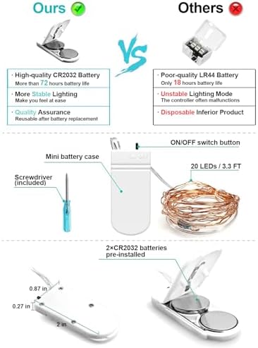 • Luces Fairy recién mejoradas de 3.3ft 20 LEDs: Nuestras luces fairy operadas por batería consisten en un cable de cobre flexible de 3.3 pies y 20 LEDs súper brillantes. Según la investigación de mercado, más clientes prefieren una longitud de cable más corta, así que mantuvimos el número de 20 luces LED pero redujimos la longitud del cable a 3.3 pies, lo que facilita hacer cualquier forma que desees sin tener que enrollar muchos círculos.