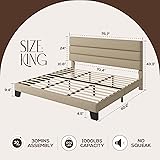 Stylish & Comfortable: King size bed frame with fabric upholstered headboard; adds elegance and sophistication to your bedroom, high-quality and affordable; provides excellent support; comfortable backrest for reading or watching TV Sturdiness & Noise-Free: Extra-thick heavy-duty feet for stable base and superior stability; supports up to 800 pounds; Eva mute bar prevents noise from friction; no annoying squeaks or creaks Wooden Slats: Provide excellent support and durability for your mattress, prevent sagging or shifting; weight capacity of 800 Lbs No Box Spring Needed: Designed with Velcro wooden slats for fast assembly; mattress does not slide; suitable for memory foam or spring mattresses without the need for a box spring Quick Assembly: King bed frame with headboard packaged in one box; easy to follow simple assembly instructions; no special tools required; straightforward and hassle-free setup