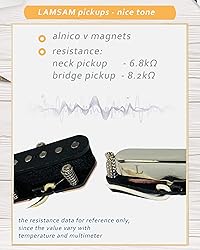 ALNICO 5 ROD MAGNETS - alnico 5 for greater focus and enhanced dynamics; copper shielding plate on the bridge pickup; chrome-plated neck pickup covers; fiber bobbin construction OUTPUT - DC resistance of neck pu is 6.8KΩ and bridge P/U is 8.2KΩ INSTALLATION IS A BREAZE - high-grade pre-tinned wire tip and push-back cloth, If you can change strings, you can change the set of two single-coil telecaster style guitar pickups SOUND STYLE - wax-potted for squeal free performance; rich tone and super responsive, great for wide range of music style POLE PIECES - flush-mount pole pieces for even string response; package includes bridge pickups and neck pups as well as their mounting hardware