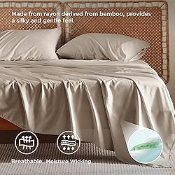 AWARD-WINNING COOLING: Made from rayon derived from bamboo, these cooling sheets reign supreme in breathability and moisture-wicking, and are endorsed by Forbes Vetted, NBC, and The New York Post. Banish sticky nights and enjoy cool, cozy slumbers 100% RAYON DERIVED FROM BAMBOO: Crafted from nature’s embrace, the sheet set is completely free of harmful chemicals, cool to the touch, and silky soft without irritating your skin. It proudly passes the OEKO-TEX Standard 100 certification(24.HCN.19195) IDEAL SLEEP COMPANION: Made from 100% rayon derived from bamboo, these bed sheets offer a cool, silky-soft feel. Perfect for hot sleepers, menopausal women, or babies. Available in a range of colors to match your style EASY FIT: Our fitted sheet fits mattresses up to 16" thick. The 360° elastic band ensures a secure fit, eliminating endless fussing. Plus, the envelope-closure pillowcases protect pillows from slipping out EASY CARE: Machine wash in cold water (below 104℉) and tumble dry low. Remove promptly or iron if needed to reduce wrinkles. For stains, pre-treat with laundry detergent instantly before washing. Do not bleach or dry clean to preserve fabric quality WHAT'S INCLUDED: This all-in-one king size sheet set includes a flat sheet (108" x 102"), a fitted sheet (78" x 80" + 16"), and two pillowcases (20" x 40"). Everything you need for a cozy bed setup, all in one package