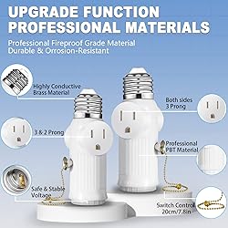 【Both Sides Support 3 Prong Light Socket to Plug Adapter】This light socket to plug adapter can support two sides 3 prong at the same time. Our light bulb outlet socket adapter can turn the original E26/E27 bulb socket into two 3 prong sockets. Both sides can support 3 prong or 2 prong at the same time, plus the E26/E27 bulb socket at the bottom, making it into a multi-socket power supply, expanding the use of a single bulb socket to meet all your power needs. 【Upgraded Switch Control Light Socket Adapter】Our light socket to plug adapter is upgraded on the basis of the previous generation with independent switch control the light bulb function, more intelligent and convenient. The light socket to plug adapter also has a safety fuse protection, when the voltage is too large will form a protection, light socket to plug adapter will automatically power off, more secure. 【Use of Professional Materials, Safe & Durable】This light socket outlet has been upgraded with more advanced flame retardant PBT material and high conductive brass, which can withstand high temperature up to 329℉ (165℃), and the safety performance has been enhanced. Our light socket adapter are more heat resistant, corrosion resistant and durable, the light socket to plug adapter is FCC listed to ensure your products are supported by the highest standards of safety and performance. 【Light Socket to Plug Adapter for Many Scenarios】This light socket to plug adapter can provide you with multiple sockets in various scenarios, such as on lampholders in warehouses, garage basements, camping tents, attics, balconies, porches, utility rooms, etc., the light socket to plug adapter can add temporary sockets for you. The light socket to plug adapter is easy and quick to install without any tools. (The power should be turned off first before installation) 【Electrical Ratings of Light Socket Adapter】Our light socket adapter uses a stable current supply of 125VAC, the max power of the light socket adapter can reach 1250W. (Note: This light socket to plug adapter is not suitable for connecting high power appliances, you need to check whether the electrical appliances exceed the rating of this socket before use. This light socket to plug adapter is not suitable for use in wet places, in outdoor please use under the socket with waterproof lampshade.)