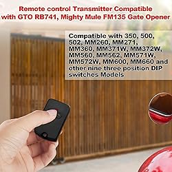 Package Content: you will receive 6 pieces of RB741 FM135 remote control and 6 clips, which are compatible with GTO, compatible with Mighty Mule door opener; The built in instructions, sun visor, and built in 12V 23A battery are sufficient to meet your use and needs, and you can operate them well Compatibility List: RB741 FM135 remote control is compatible with GTO, compatible with Mighty Mule door opener, such as 350500502, MM260, MM271, MM360, MM371W, MM372W, MM560, MM562, MM571W, MM572W, MM600, MM660 and other 9 DIP switches, with 3 positions and a working frequency of 318MHZ Easy to Program and Carry: built in English instruction manual, easy to operate and program, just follow the steps to complete your own code settings, highly safe and reliable, small size, light weight, easy to carry Supported Models: 350, 500, 502, MM260, MM271, MM360, MM371W, MM372W, MM560, MM562, MM571W, MM572W, MM600, MM660 and other nine three position DIP switches Safe and Reliable: after the new upgrade, the latest RF technology and powerful security encryption design ensure a better working range, which can significantly reduce the radio wave interference signal reception and transmission range, up to 100 feet, and compatible with Mighty Mule, compatible with GTO opener; The highest level of encryption gives you peace of mind; Long distance stable operation