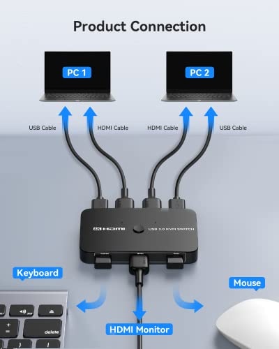 - 【USB KVM HDMI Switch Box】This HDMI KVM Switch allows you to control 2 computers with only one set of USB devices (Monitor, Mouse, Keyboard and Printer). You can easily switch between two displays with one button-pressing,it is not only a monitor switch but also a keyboard mouse switch.
