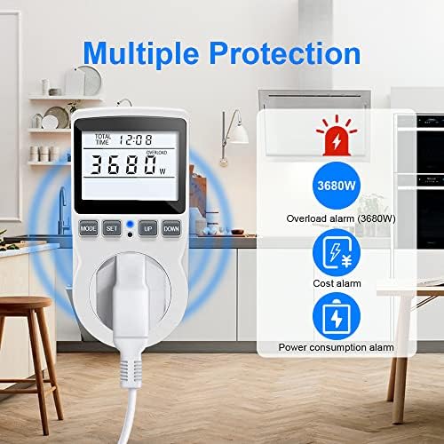 - 【Multiple Protection】When the power, power consumption or energy cost reaches the set value, "OVERLOAD", "KWh ALARM" or "COST ALARM" flashes on the screen and LED indicators to warn the users. The default overload power is 3680W ( 0~3680W adjustable ). Ideal for monitoring the energy consumption of household appliances.