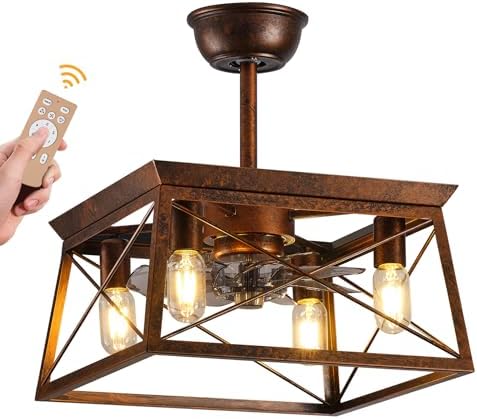 Farmhouse Ceiling Fans with Lights Remote Control Rustic Ceiling fans with Lights Caged Fandelier Flush Mount Ceiling Fan with Light Indoor Outdoor for Gazabo Bedroom Dining Room Living Room