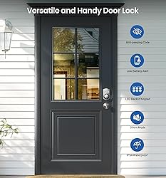 4 in 1 Unlock: Supports up to 20 user codes, 1 master code, 2 backup keys, and unlimited one-time passwords that auto-delete after use. Perfect for families, guests, dog walkers, and cleaners—no more hiding keys Auto Lock & One Touch Lock: Set front door lock to automatically secure itself 10–99s after closing—perfect for busy days or forgetful moments. One-touch locking activates by holding any key for 2s. Inside, a simple knob turn locks or unlocks the door in just 1s Anti-Peep & Tamper Protection: Anti-peeing privacy code allows random digits before or after the real code to prevent prying eyes. After 10 consecutive incorrect attempts, keypad deadbolt lock enters a 3-minute lockout to stop code guessing Vacation & Passage & Silent Mode: Vacation mode disables all user codes, allowing access only via the master code or key and triggers an alarm for forced entry. Passage mode Keep the door unlocked during parties or family gatherings by disabling auto-lock. Silent mode enables quiet entry while critical alerts remain active Built to Last: ANSI/BHMA Grade 3 Certified, this keyless entry door lock with handle features 2 door knobs, and utilizes a robust lock cylinder and zinc alloy construction for decades of reliable use. IP54 weatherproof, operating from -31℉ to 158℉ Reliable Power & Backup Access: Powered by 4 AA batteries for over 1 year of use.A red indicator warns you before power runs low, and 2 included keys guarantee entry even with dead batteries. Backlit keypad with durable silicone keys allows easy use at night 10‑Minute Easy Installation: Electronic smrt lock for front door fits most U.S. standard left‑handed and right‑handed doors, suitable for both interior and entry doors.Compatible with 1-3/8"–2" (35mm–50mm) door thickness and 2-1/8"(54mm) hole diameter. Includes manual and video guide—install with just a screwdriver, no professional required 2-Year Warranty & Lifetime U.S. Based Support: Backed by a 24 months full product warranty and lifetime component maintenance. Enjoy U.S.-based phone support (Mon–Fri 9 AM – 5 PM | Sat 7 AM – 3 PM PST)) and 24/7 email assistance for worry-free