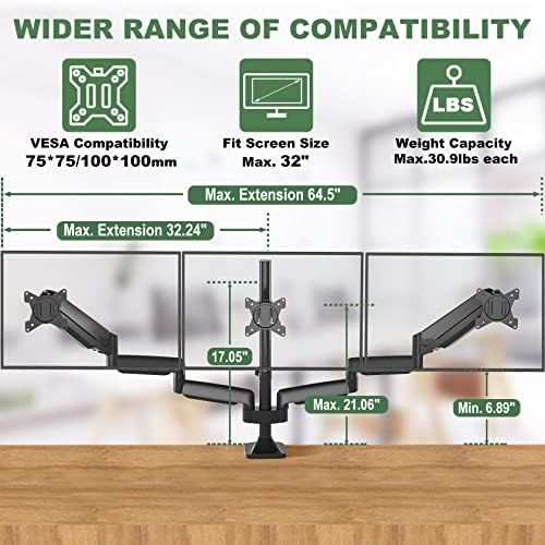 - Built to Last: Constructed of high-grade steel, our triple monitor arm features premium gas spring system - after over 25,000 exercise tests - bearing a max weight capacity of 30.9 pounds, which is strong enough to hold 3 screens securely. Enjoy a comfortable peripheral view with full motion compression arms that support tilt, swivel, rotation and height adjustment. Freely set your monitors to landscape or portrait mode