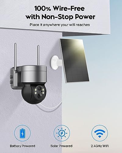 • 【Instalación Inalámbrica Flexible y Pan-Tilt】- Esta cámara de seguridad solar para exteriores es 100% inalámbrica y fácil de instalar, ofreciendo máxima flexibilidad de colocación. Las antenas duales proporcionan una conexión de red más fuerte y estable, permitiéndote recibir tus datos en un área más amplia. Ángulos de Pan 360° y Tilt 90° para cámara de seguridad PTZ para exteriores, cobertura completa de 360° sin puntos ciegos, asegurando la seguridad de tu hogar en todo momento. (Por favor, ten en cuenta: esta cámara de seguridad solo soporta Wi-Fi de 2.4GHz)