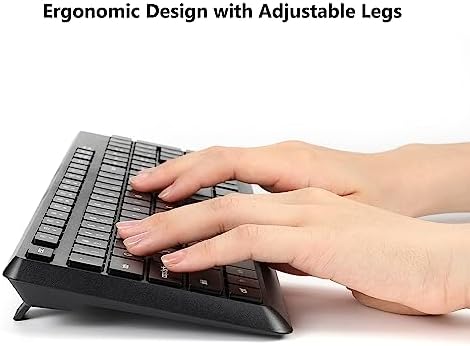 - Full Sized Keyboard Layout: The ergonomic keyboard is equipped with adjustable height tilt legs to maintain optimal tilt and prevent your wrists injury when typing for a long time. The full size keyboard with numeric keypad and 12 multimedia shortcut keys, such as play/ pause, volume increase and decrease, and email, to help you improve work efficiency