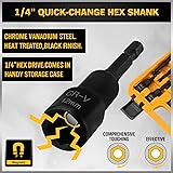 【SUPERIOR MAGNETISM】 ELEAD 47-piece magnetic nut driver & screwdriver bit set employs a strong magnetic process for superior bit retention, using gravity pressing to inlay magnets, preventing drop-offs and enhancing longevity. 【EXCEPTIONAL QUALITY】 Each impact driver bit is crafted from CR-V steel for superior shock resistance and hardness. Drill bits are made of high-quality S2 alloy steel, with sturdy hardened & tempered construction, all blackened by manganese phosphate for wear, oxidation, and corrosion resistance. 【COMPREHENSIVE VARIETY】 The magnetic nut driver set boasts 16 pieces, including Metric and SAE sizes, as well as drill bit adapters and extensions, making it versatile enough for a wide range of applications. 【VERSATILE BITS】 Our magnetic screwdriver bit set includes Phillips, Slotted, Hex, Pozidriv, and Torx, compatible with 1/4" socket and drills, alongside a ratchet wrench, ensuring you're equipped for any task. 【CLEAR IDENTIFICATION】 The size of each nut driver is engraved using a powerful roller stamping machine, ensuring easy identification and durability. The bit holder outperforms competing products in storage and organization, preventing scattering and breakage.