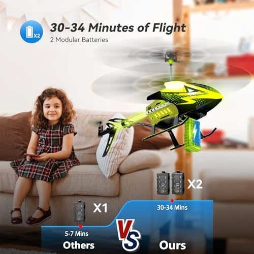 - Built to Endure: With a single modular battery delivering 15-17 minutes of flight time and the inclusion of two batteries doubling your enjoyment to 30-34 minutes, we guarantee extended entertainment. Cutting-edge rechargeable modular batteries incorporate advanced safety features against over-charge, over-current, and low voltage incidents. Our helicopter's robust PVC body and protective landing gears fortify its resilience, acting as buffers against collisions and crashes. The Alloy Structure further shields delicate components from external impacts.