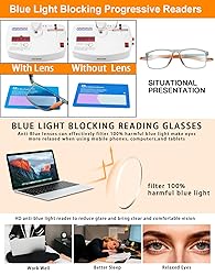 - Professional Photochromic Progressive Reading Glasses with Blue Light Filter & UV protection. These multifocal glasses for men and women are the perfect all-in-one solution for reading, computer work, and outdoor use. The innovative lenses combine three key technologies: 1) Progressive (no-line bifocal) design with seamless near, intermediate, and distance vision zones. 2) Light-adaptive photochromic lenses that quickly darken in sunlight to a comfortable sunglass tint and clear indoors. 3) Constant blue light filtering coating to reduce digital eye strain from screens.Ideal as computer glasses, indoor-outdoor readers, or daily wear sunglasses. Crafted with a durable, lightweight, and flexible TR90 full frame for lasting comfort. The spring hinge temples provide a flexible, secure fit for various face shapes, while the soft adjustable nose pads prevent slipping and pressure. A fantastic gift idea for anyone who uses readers.