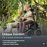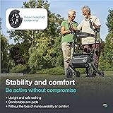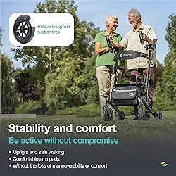 PAIN-FREE AND SAFE WALKING - With its soft padded armrests the Helavo upright walker enables you to walk safe and straight, relieving your shoulders and back. The rollator also comes with height adjustable ergonomic handles, which also support you to walk in a natural position and reduce pain on your arms and upper body. OPTIMAL CUSHIONING OUTDOOR - The 10" rubber front wheels enable safe and comfortable movement on almost any surfaces and make this upright walker the perfect choice for people who need a mobility aid which they can also rely on outdoors. Helavo puncture-proof rubber tires have excellent durability and very good cushioning characteristics, with no risk of a flat. HIGHEST SAFETY STANDARDS – All Helavo rollators are designed to meet established quality and safety requirements. This stand-up walker has a durable aluminum frame weighing 22.7 lbs and measures 26.4" D × 26.4" W × 46.9" H. It supports users up to 300 lbs. The seat is 18.9" wide and 9.1" deep, with a maximum height of 22". The walker is equipped with an easy-to-use braking system, including a parking brake. ALL-IN-ONE PACKAGE - The Helavo upwalker comes with a cup holder and an integrated cane holder. It also has a height-adjustable, softly padded backrest and a spacious, cushioned seat, perfect for a short rest on your trip. The armrests are made of a soft yet extra-durable material and are highly durable. GERMAN ENGINEERING DESIGN AND SERVICE - All our rolling walkers come with a standard two year warranty, which can be extended to three years. We offer 24/7 support and high availability of replacement parts. This rollator also features a simple assembly including video instructions.