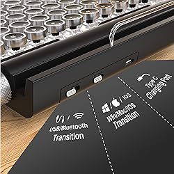 Authentic Typewriter Experience: This Retro Mechanical keyboard offers a typing experience reminiscent of a genuine typewriter. The blue switches offer a satisfying clicky sound and tactile feedback, fluid and speedy typing requires minimal finger/hand fatigue. It's perfect for those who do a lot of writing or typing and makes typing feel both enjoyable and authentic 14 Modes Backlighting Switching: The round keycap design with punk style adds personality to your desk and enhances the look of this wireless mechanical keyboard. The LED backlighting is easily adjustable using the stainless-steel lever. The left and right knobs control the brightness and volume respectively, and there are 14 backlight modes to choose from, allowing you to customize the keyboard to your individual preference Double-Modes Connectivity: Offering versatile connectivity, the retro mechanical keyboard can be connected via USB-C or Bluetooth to three different devices. allowing you to switch between your tablet, laptop, and phone. Compatible with Windows / macOS / android. This makes it the perfect pick, not just for gamers, but also for professionals who require seamless connectivity with multiple devices Hot-Swappable Design: With hot-swappable keycaps and switches, the light-up keyboard allows users to personalize their gaming setup according to their preferences. Users can easily swap out keycaps and switches without any tools, making customization quick and effortless Compact and Ergonomic Design: Designed to perfection, our typewriter wireless keyboard has an ergonomic build that ensures a comfortable typing experience. Concise design with 83 keys total (no numeric keypad) , the keyboard becomes more versatile and provides additional desk space which can be used more productively Durable Metal Frame: Our bluetooth gaming keyboard is built with top-quality materials and a durable metal frame providing greater stability, leading to a longer lifespan. The advanced manufacturing process ensures the keyboard can withstand thousands of keystrokes without compromising its performance. Our keyboard has been through stringent quality checks before being released in the market Device Holder for Easy Access: The device holder in front accommodates smartphones and tablets, providing easy access to your devices. This allows you to keep your device close to you, providing greater efficiency while working on multiple devices simultaneously. This feature is especially helpful in a work setting for various professionals